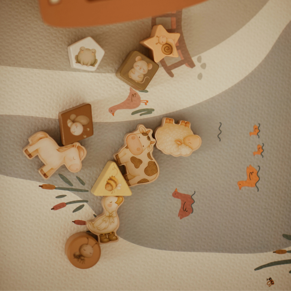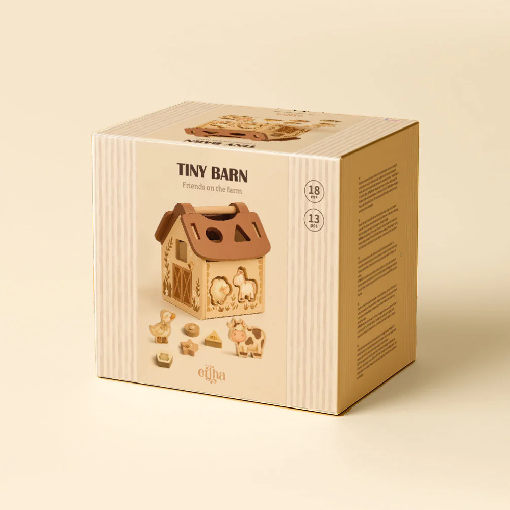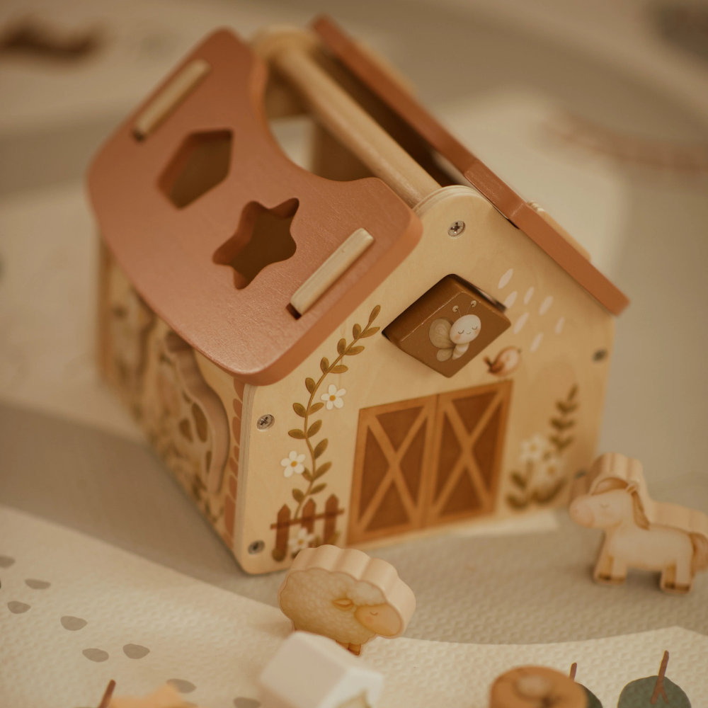 Ez a fából készült pajta nyugodt, Montessori játékra ösztönöz: nincsenek villogó ingerek, helyette természetes anyagok és egy egyszerű "próbáld ki-próbáld-felfedezd" mechanizmus.
