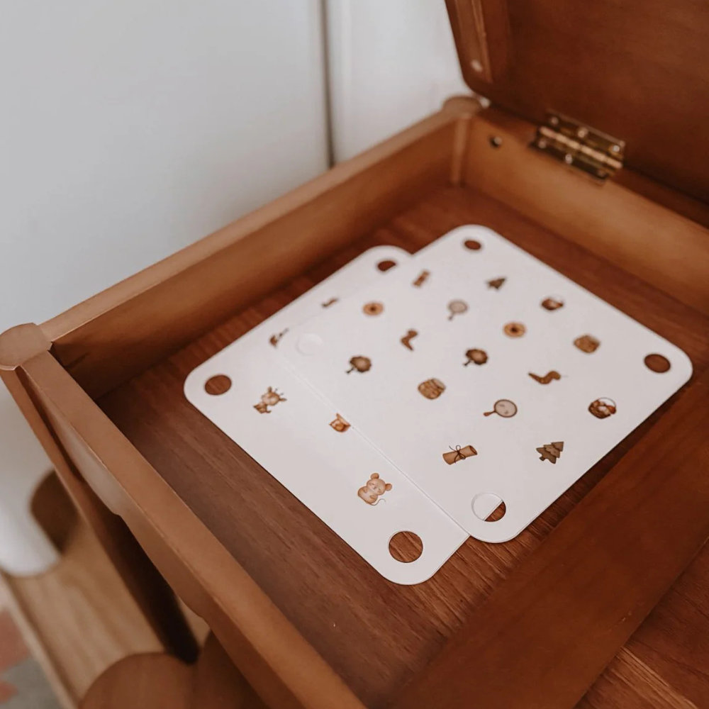 A dobozban egy fatábla, 14 3D alma és 14 párosító illusztráció vár.