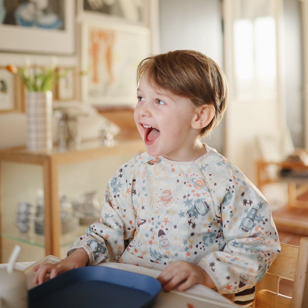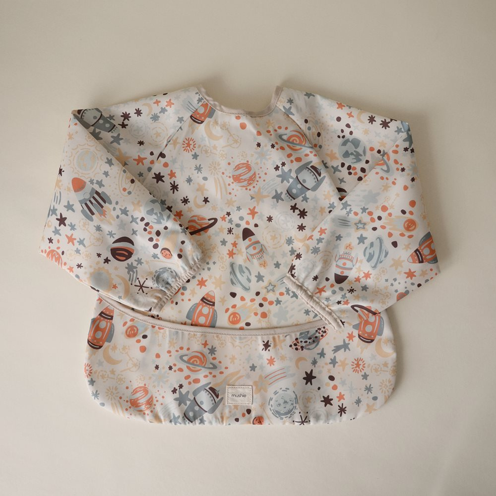 A Mushie hosszú ujjú, vízálló melltartó okos módja annak, hogy megvédje a ruháját evés, festés vagy más kreatív játék közben, amely általában foltokban végződik.