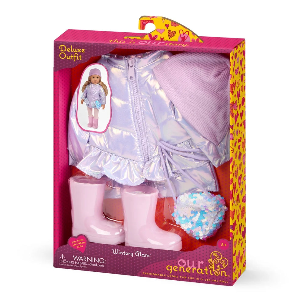 Our Generation baba ruhakészletünk fényes pehelykabáttal és flitteres táskával