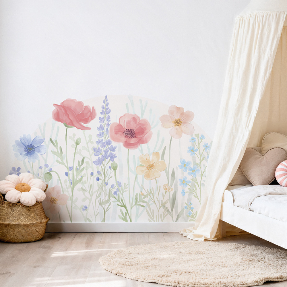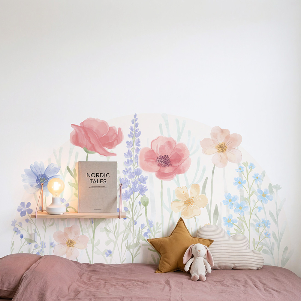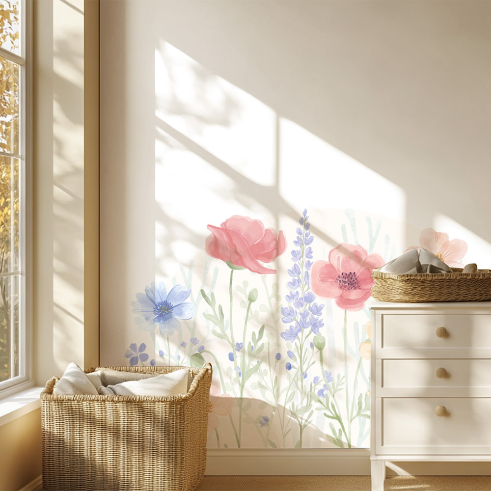 Stell dir die Wand im Zimmer deines Kindes vor, über die zarte Pastellmohnblumen, kleine Vergissmeinnicht und Feldblumen sanft wandern – als hätte sich hier eine Frühlingswiese dauerhaft niedergelassen.
