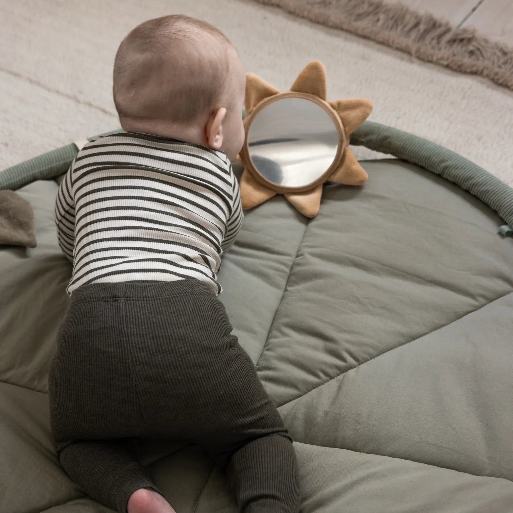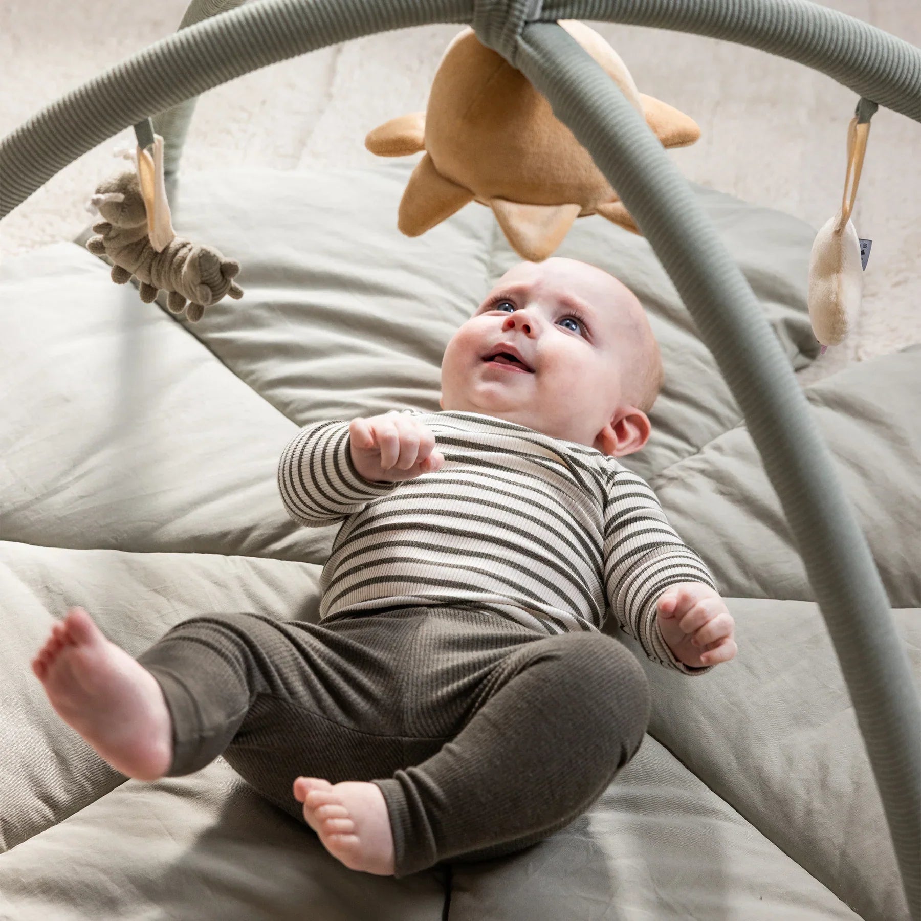 Az ívek szelíd korlátot képeznek, hogy a játékok elérhető távolságban maradjanak a kezek számára, és motiválják a babát, hogy felemelje a fejét és erősítse a testét.