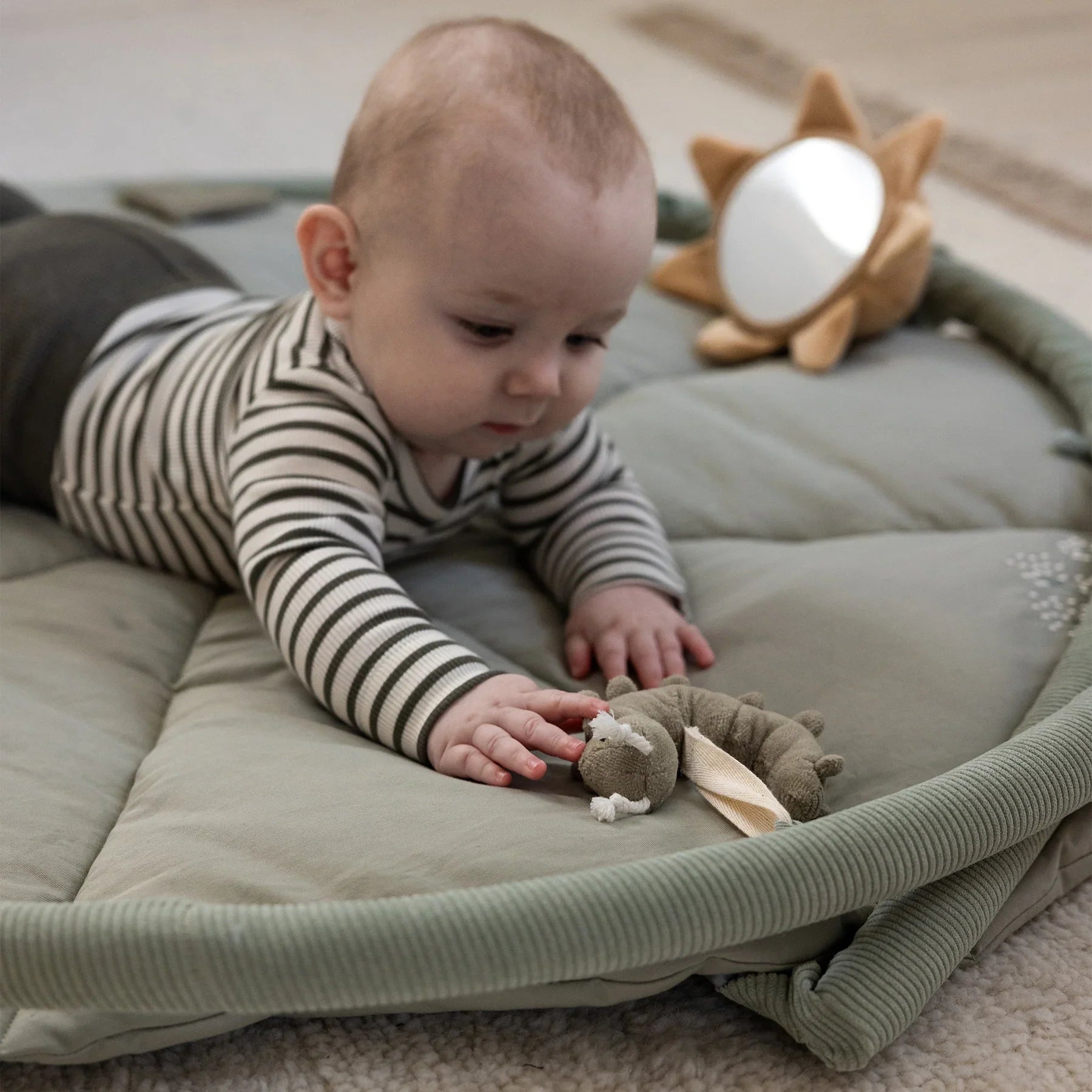 Az oktatószőnyeg biztonságos, kényelmes helyet biztosít a babának, ahol a hátán és a hasán fekve is felfedezheti a világot.