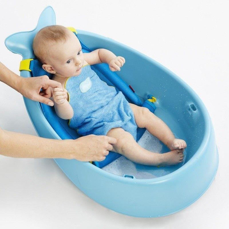 A Skip Hop Growing With Baby Whale Blue fürdőkád állítható üléssel rendelkezik, amely kifejezetten a baba fejlődési szakaszaihoz igazodik.