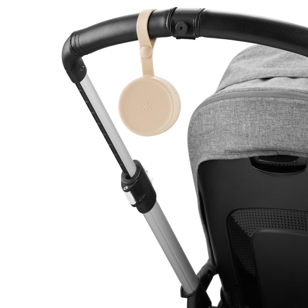 A praktikus fogantyúnak köszönhetően könnyen rácsatolható a babakocsira, az autóülésre vagy a táskára, így a bábu mindig kéznél van.