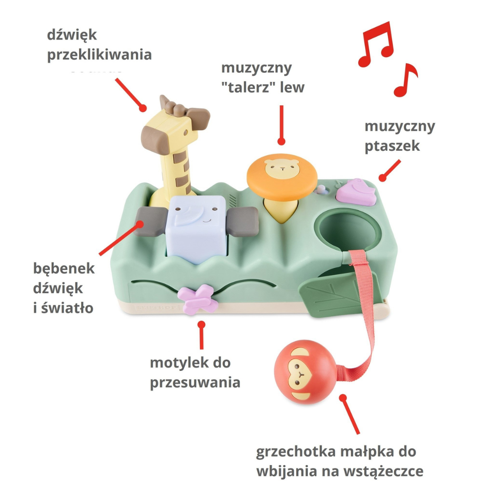 A zenélő és kopogtatós játék tartalmaz egy zsiráf formájú kis kalapácsot puha fülekkel és puha orral, egy oroszlán alakú világító korongot, egy elefánt alakú bongódobot, egy zenélő madarat, egy majomcsörgőt, egy bújócska levelet, egy pillangócsúszót és 12 állathangot, dalt, dob- és cimbalomhangot.
