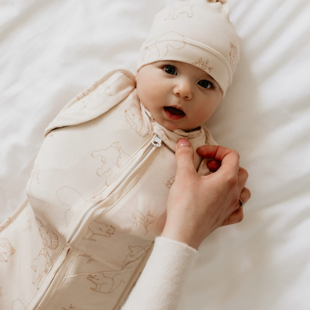 Sleepee Baby Wrap sapkával First Step Veterán állatok mandula