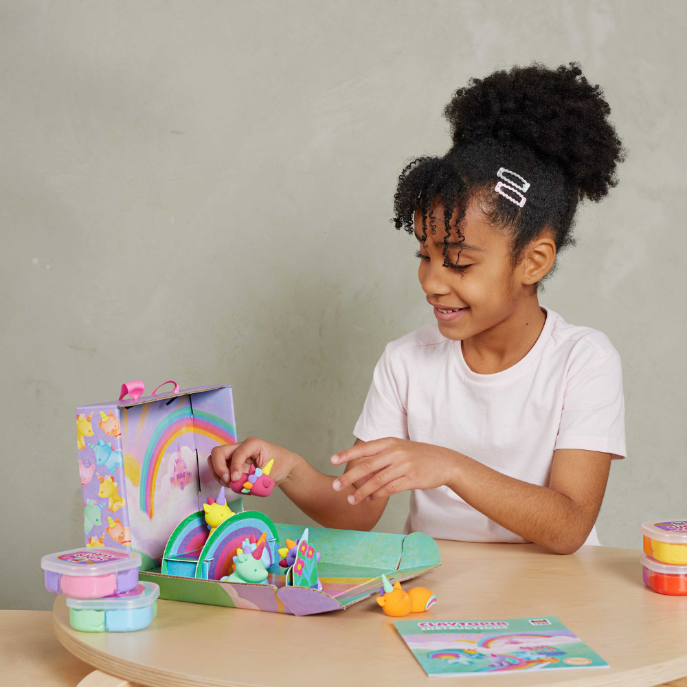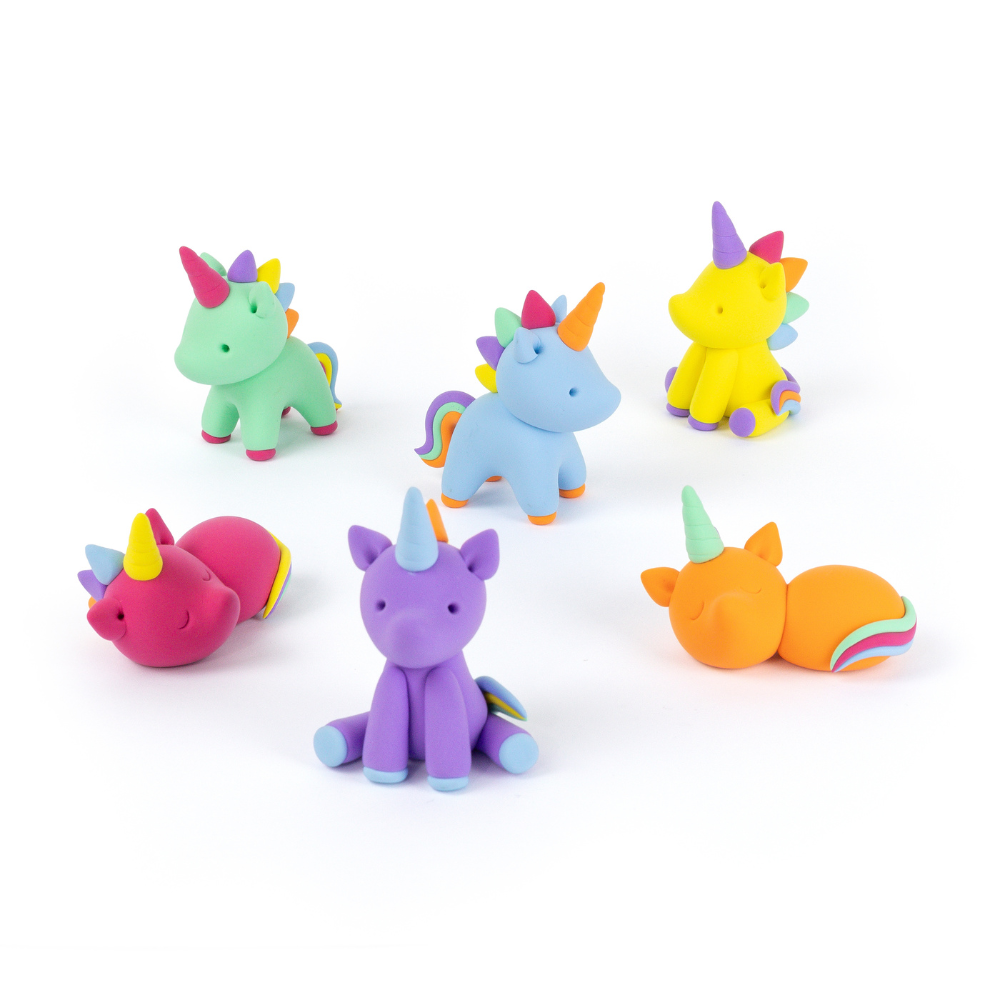 Lépésről lépésre történő alkotás - a készlet különböző színű öntőmasszákat és egyszerű utasításokat tartalmaz, így gyermeke maga is készíthet néhány imádnivaló egyszarvút.